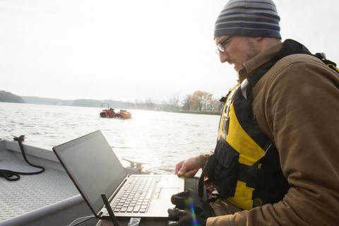 IHR—Hydroscience and Engineering researcher Casey Harwood peruses data from an amphibious Gibbs Quadski (seen in the distance) at the Coralville Reservoir to better understand how the machine will perform in coastal waves—a notoriously difficult zone of operation. Photo by Tim Schoon.